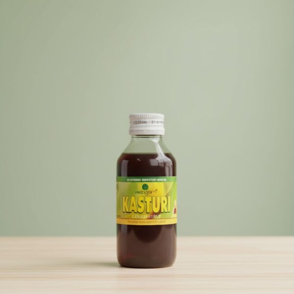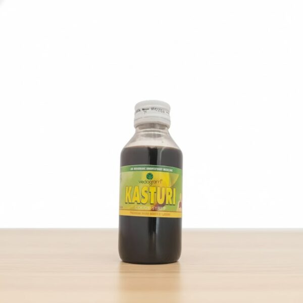 Kasthuri Cough Syrup is an Ayurvedic herbal syrup with Yashtimadhu, Tulsi, and Vasaka that soothes the throat, relieves dry cough, clears airways, and supports respiratory health.