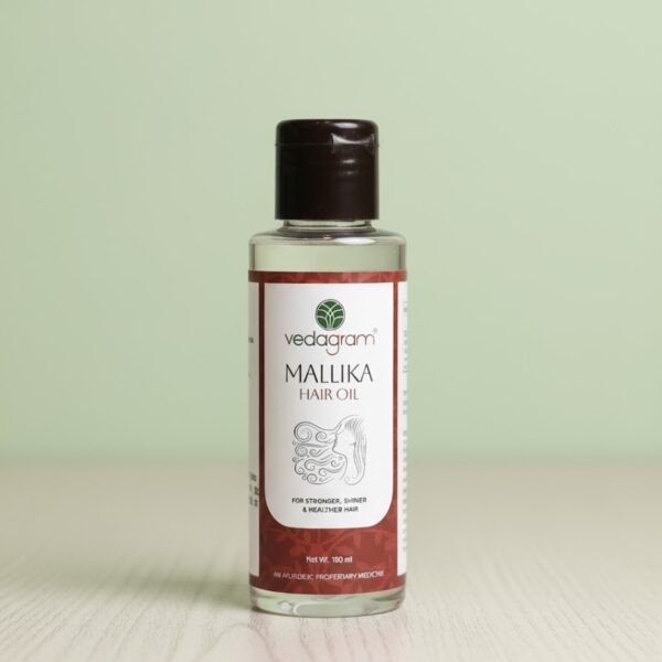 Mallika Hair Oil is a patented Ayurvedic formula by Vedagram that strengthens hair, prevents hair fall, dandruff, and premature greying, promoting thick and healthy hair naturally.
