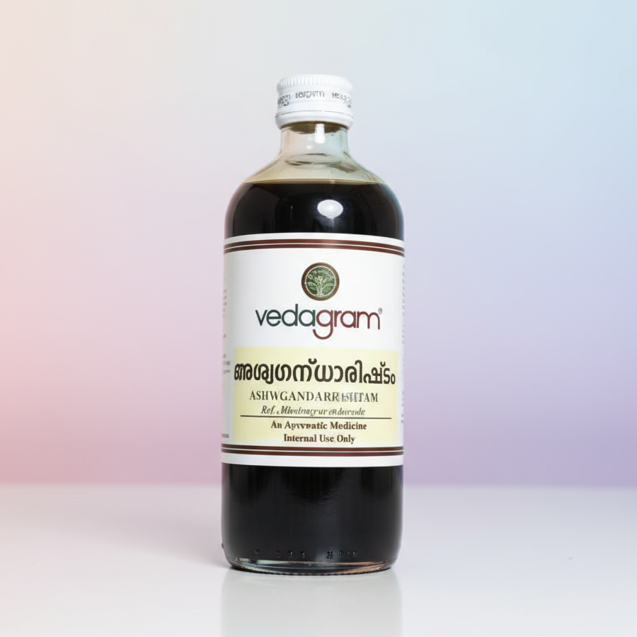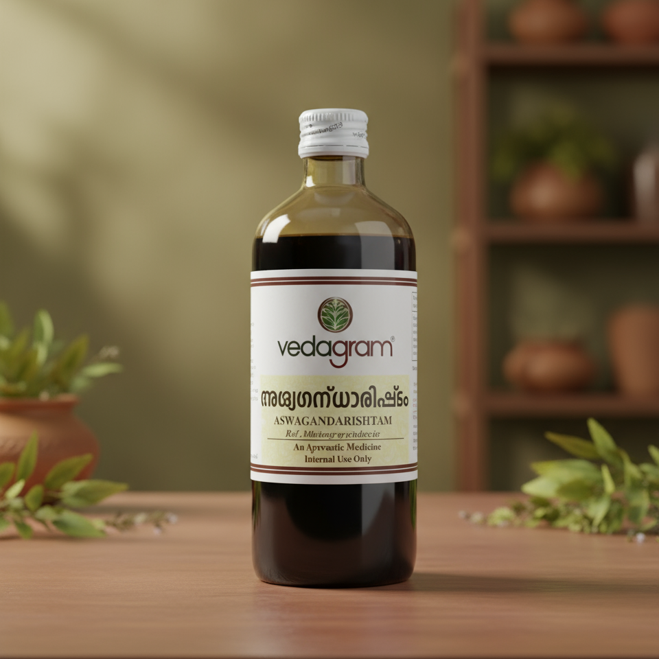 Aswagandharishtam is an Ayurvedic tonic that helps reduce stress, improve strength, and support overall vitality.