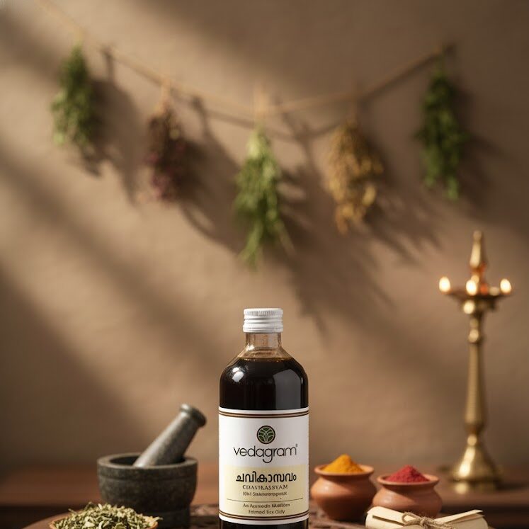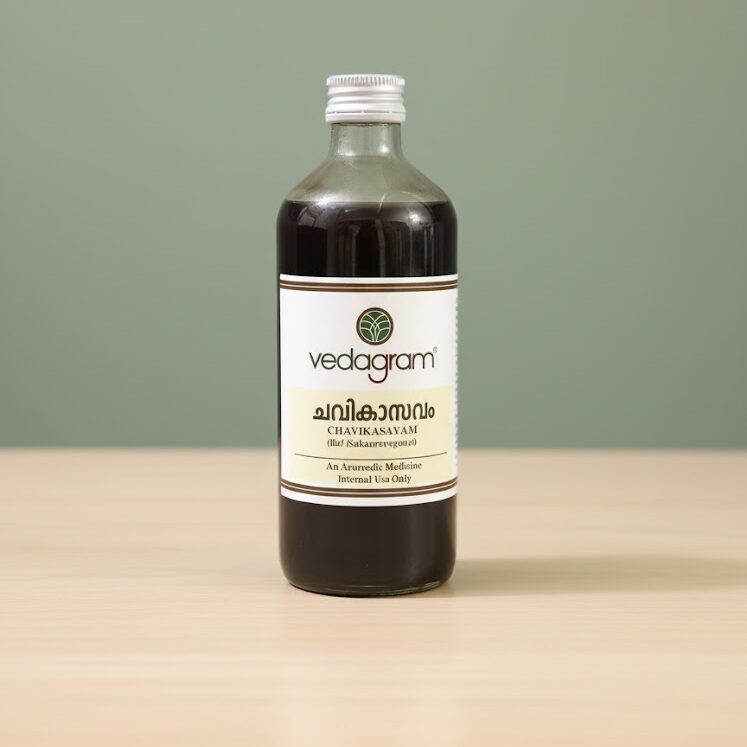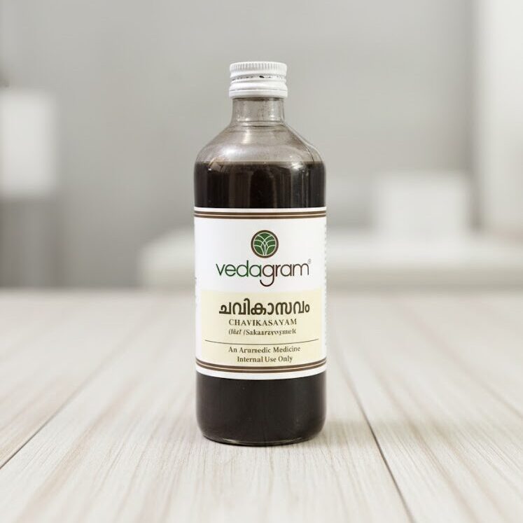 Chavikasavam is a traditional Ayurvedic tonic that supports digestion, reduces gas and indigestion, and promotes respiratory wellness. It helps boost metabolism and overall strength.