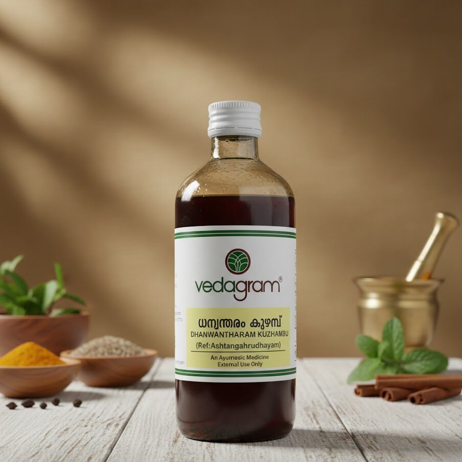 Dhanwantaram Kuzhampu is an Ayurvedic body-strengthening oil formulated to reduce pain and stiffness while supporting muscle, nerve, and postpartum wellness.
