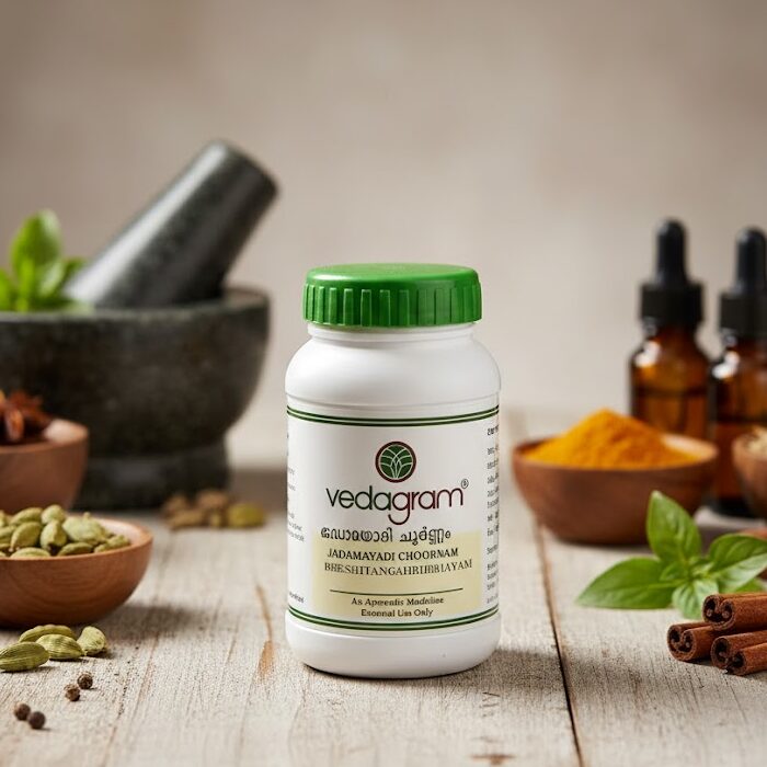 Jadamayadi Choornam is a traditional Ayurvedic herbal powder used externally to relieve swelling, inflammation, and pain in joints and muscles. It is commonly applied as a poultice for sprains, injuries, and localized discomfort.