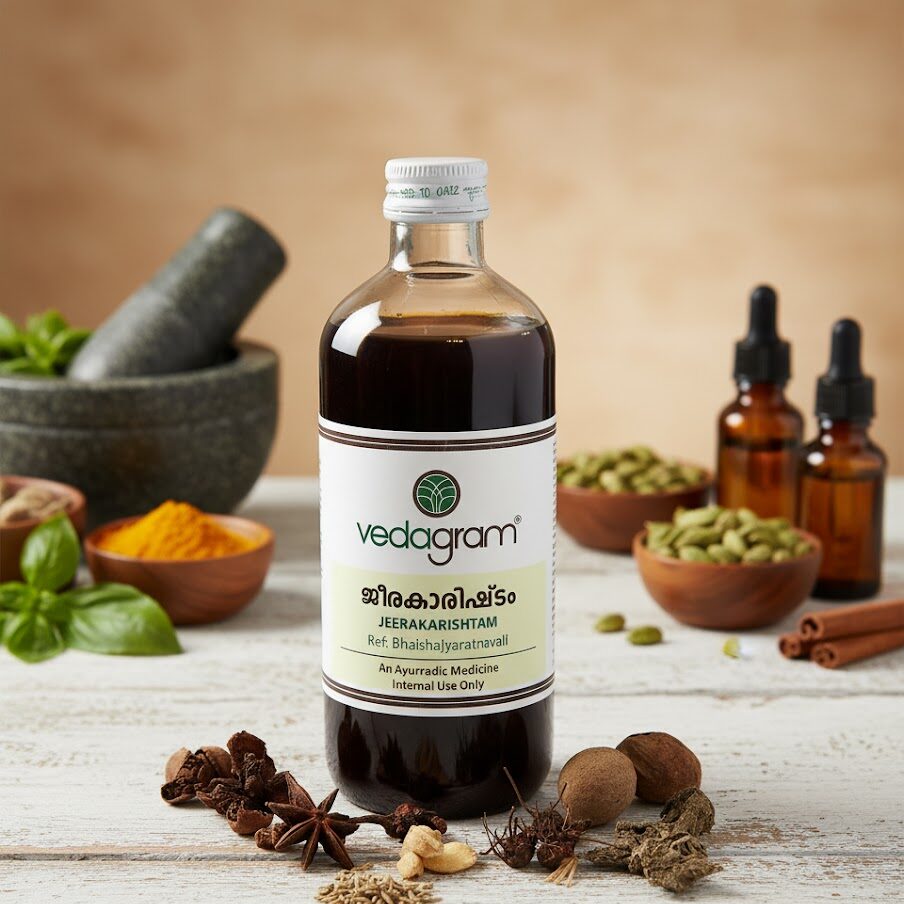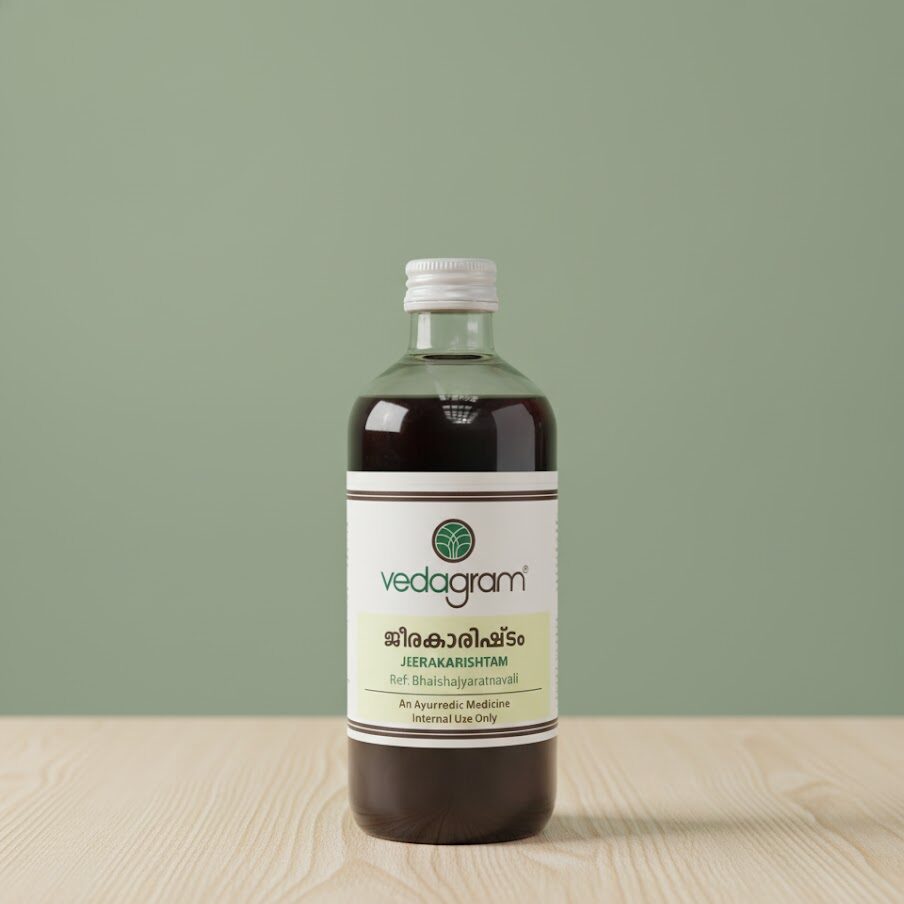 Jeerakarishtam is an Ayurvedic cumin-based digestive tonic that helps reduce bloating, improve appetite, and support postpartum recovery.
