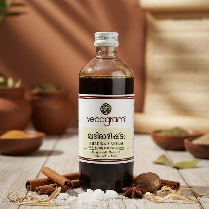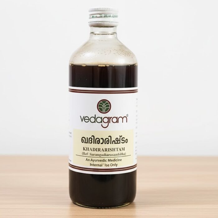 Khadirarishtam is an Ayurvedic herbal tonic that purifies the blood, supports skin health, manages skin conditions, and promotes overall wellness.