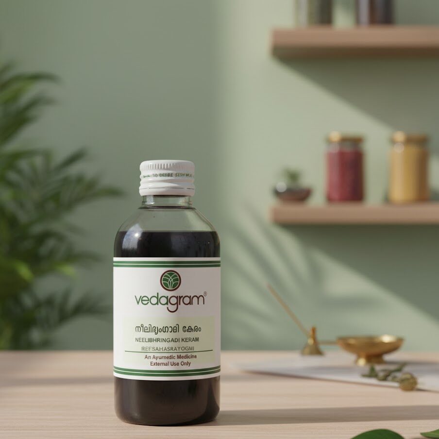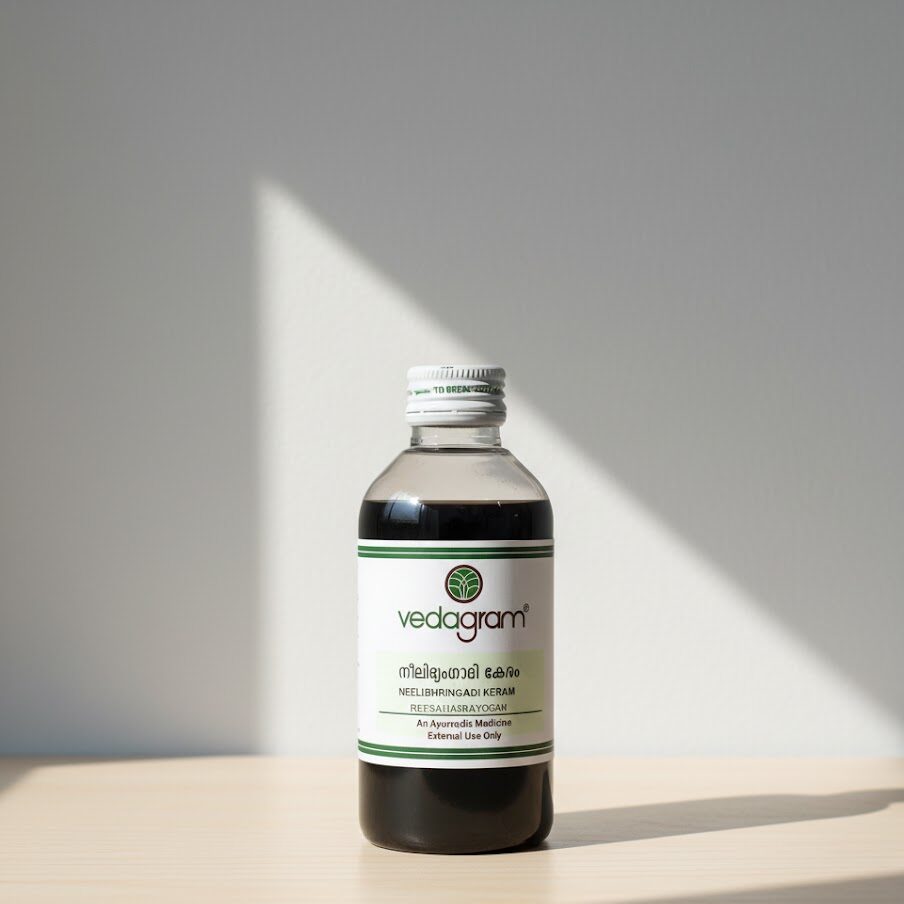 Neelibringadi Keram is a traditional Ayurvedic hair oil formulated to prevent hair fall, dandruff, and premature greying. Enriched with herbs like Neeli and Bhringraj, it nourishes the scalp and promotes healthy hair growth.