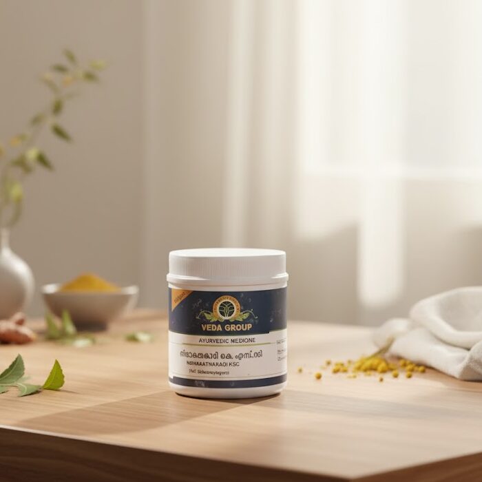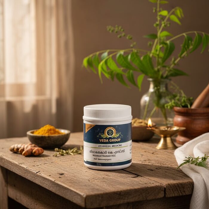 Nisakathakathi Kashayam (K.S.C) is a traditional Ayurvedic formulation used to support healthy blood sugar levels and improve metabolism. It helps purify the blood and maintain overall wellness.