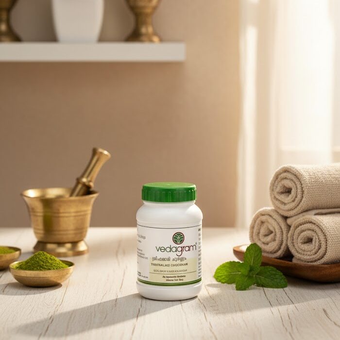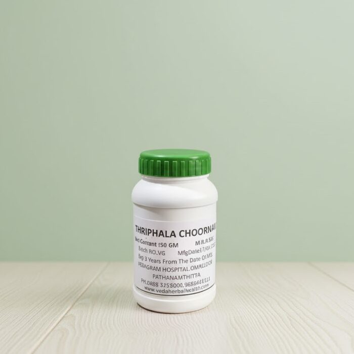 Thriphala Choornam is an Ayurvedic digestive powder that relieves constipation, supports digestion, cleanses the gut, and promotes natural detoxification for overall wellness.