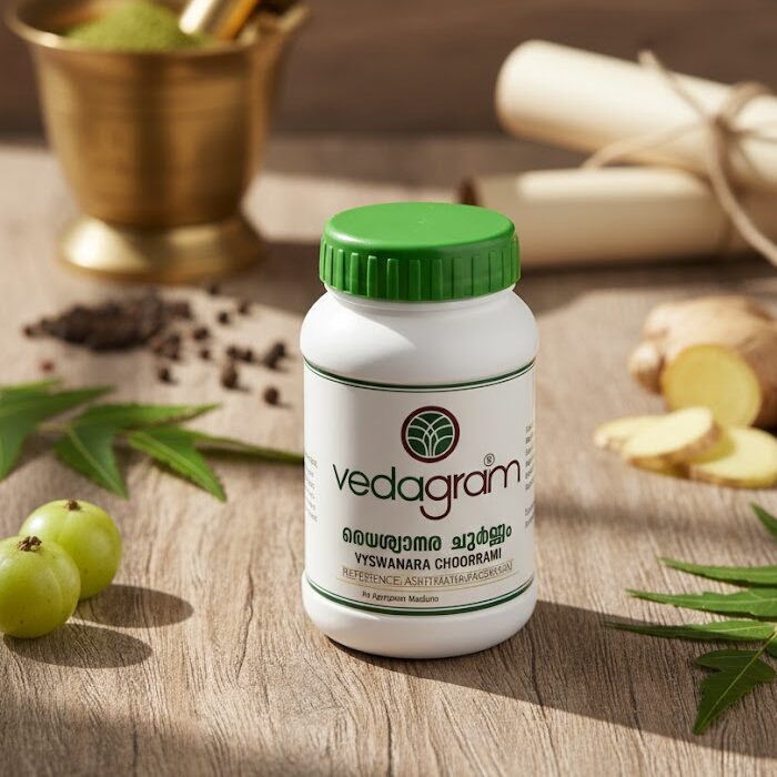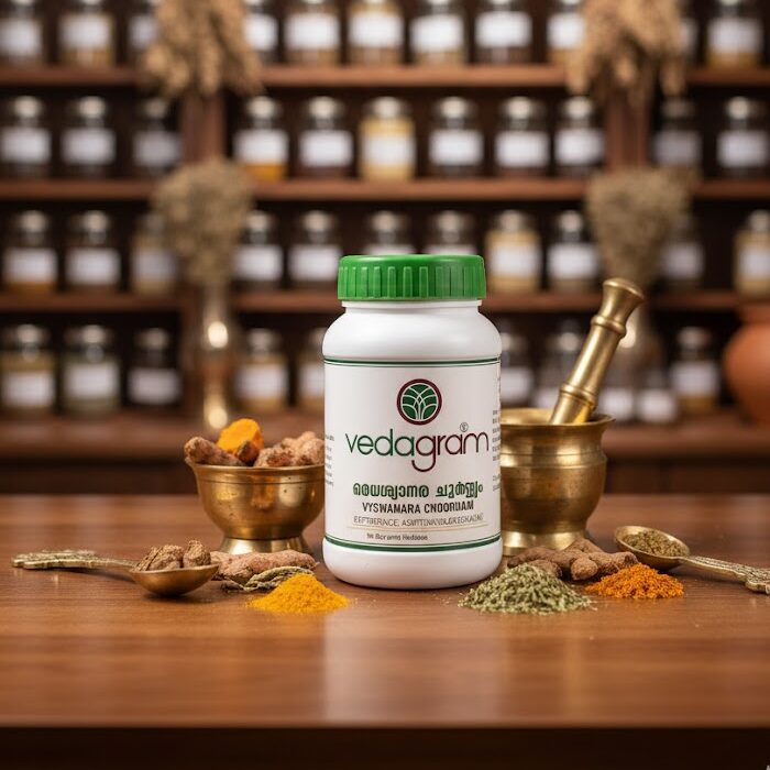 Vyswanara Chooranam is an Ayurvedic herbal powder that supports respiratory health, reduces congestion, and improves digestion for overall wellness.